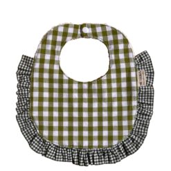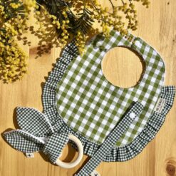 - 1 babero: confeccionado en tea vichy de algodón 100% orgánico e rizo de toalla (que é máis absorbente que outros tecidos). Péchase cun botón a presión ou snap. Lavable en máquina a un máximo de 30º. Pode pasarse o ferro a unha temperatura adecuada para o algodón. Non utilices lixivias nin produtos agresivos que poidan danar os tecidos.