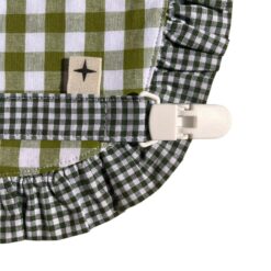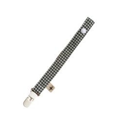- 1 chupetero: a conxunto, coa mesma tea vichy de algodón 100% orgánico. Engánchase á ropita do bebé cunha pinza. O chupete suxéitase facilmente polo outro extremo, onde está o snap. Recomendable lavar a man, xa que a pinza non se pode quitar. Pode pasarse o ferro a unha temperatura adecuada para o algodón. Non utilizar lixivias nin produtos agresivos que poidan danar os tecidos.